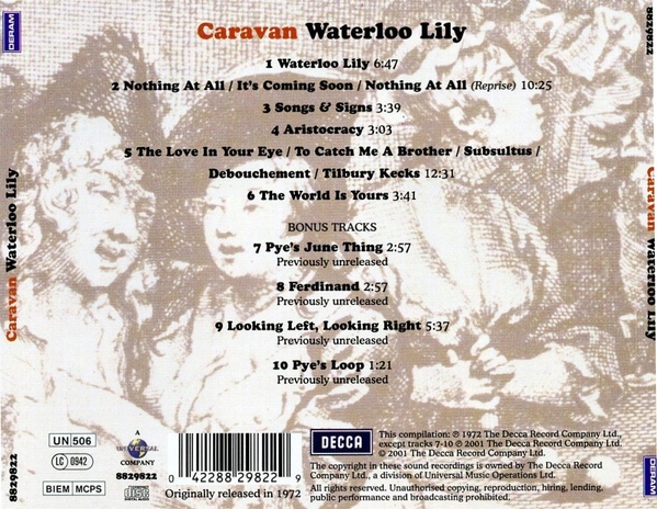 TRACKLIST 1 Waterloo Lily (6:47) 2 Nothing At All/It's Coming Soon/Nothing At All (reprise) (10:25) 3 Songs And Signs (3:39) 4 Aristocracy (3:03) 5 The Love In Your Eye/To Catch Me A Brother/Subsultus/Debouchement/Tilbury Kecks (12:31) 6 The World Is Yours (3:41) Bonus Tracks on 2001 CD 7 Pye's June Thing (2:57) 8 Ferdinand (2:57) 9 Looking Left, Looking Right (5:37) 10 Pye's Loop (1:21) |