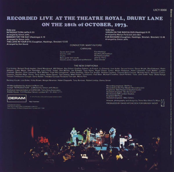 «Do it with an orchestra» was quite a heavy trend back in the days when symphonic rock was king, although, when you really think about it, not that many heavyweights actually went for this: Deep Purple in 1969, Procol Harum in 1972, and... well, ELP and Renaissance joined in somewhat later, I guess. Essentially, though, this Caravan album repeats the formula of Procol Harum's Live With The Edmonton Symphony Orchestra: use the symphonic potential of the orchestra to enhance the effect of originally non-orchestrated material, rather than blend it with the rock group format in some particularly innovative, genre-fusing way (like Deep Purple did, albeit with questionable results). Not that this is a bad idea: Caravan's highly melodic and already classically influenced melodies seem like a natural fit with symphonic orchestration, and, in fact, the whole idea seemingly came out not out of the desire to jump on the Procol Harum bandwagon, but out of the experience of working with a full orchestra on the Plump In The Night sessions. I have not been able to uncover any additional activities of this «New Symphonia» orchestra, but I do know that it was essentially the creation of conductor Martyn Ford, who had already specialized in working with contemporary non-classical musicians, and that the orchestral 'Introduction' here was credited to Simon Jeffes, founder and leader of the Penguin Cafe Orchestra — meaning that, unlike Procol Harum, who could actually afford an authentic classical orchestra to work with them, Caravan went along with relative neophytes and barrier-breakers. Nevertheless, an orchestra is an orchestra, and you won't be hearing any classical musicians trying out rock riffs during this concert. The recently released expanded edition of the album shows that the actual performance consisted of a short first set, during which the band played highlights from the Plump In The Night album on its own; a larger second set with the orchestra, all of which was released on the original LP; and an encore of 'A Hunting We Shall Go', for which the orchestra stayed on to reproduce the original arrangement (although, as the liner notes state with a whiff of reproach, not before a little blackmail-and-bluff took place backstage, since the musicians wanted their pay enlarged for the encore, and only went ahead after Pye threatened they'd do it without them anyway). The main set, apart from the already mentioned 'Introduction', included two new compositions written specially for the concert, and two old multi-part epics, perfectly suitable for orchestration — not a lot, really, but I guess that budget concerns played a large part in this, too. So, how well does Caravan work with an orchestra? I'd say that this is a good match on the whole, especially as far as the bombastic instrumental passages on the epic numbers are concerned, such as the martial brass fanfares in 'The Love In Your Eye' and the last, hard-rocking, movement of the 'For Richard' suite, where the orchestra replaces Sinclair's distorted organ riffs. The new arrangements are not necessarily better, but the orchestra does lend extra romanticist power to the material without dumbing it down; in a way, one might even argue that The New Symphonia is really that one last crucial ingredient they'd always needed to evolve into a massively powerful music-making machine — the catch is, it's far from certain that they ever needed to evolve into a massively powerful machine, but if you thought they did, here is where they do, or at least come fairly close to doing. Pye's thin, frail, slightly effeminate voice almost feels a bit pitiful against this massive background, though — perhaps they should have hired Ian Gillan for this night... then again, perhaps not. At least his mike stayed in good shape. Of the two new compositions I have to say that 'Mirror For The Day' is a lush sentimental pop ballad in Pye's already fully-crystallized style (presaging more and more of this material on the band's next records), made somewhat more distinct by using a background vocalist choir with gospel overtones; and 'Virgin On The Ridiculous' is mostly memorable for its self-explanatory title — otherwise, it is an even slower, longer, and more pompous ballad without any particularly notable musical ideas. However, in both cases the synergy between the band and the orchestra is well-balanced, and on 'Virgin' at least, much of the main melody is provided by strings in the first place (except for the instrumental bridge, dominated by the organ), so we can all just take this as rehearsal materials for Pye Hastings' Canterbury Oratorio. Naturally, this is not an essential release to have in your collection, and naturally, it is atypical of the usual Caravan live sound — with which you can easily acquaint yourself on ten thousand archival releases from the BBC and various venues — but on the whole, it's an intelligent and resonant fusion, in which the power and the subtlety of the orchestra are anything but wasted. And I even like the 'Introduction', especially the clever way in which the orchestra first introduces itself with an impressionist piece, then passes the baton over to the band for some blues-rock jamming, then smartly fills in the gaps around the band to become one with them: that Simon Jeffes is one darn fine fella when it comes to synthesizing rock with classical. So, overall, this is a very easy thumbs up for me, and a moderately tasteful success for Caravan in the year when clouds began seriously darkening around the pillars of the symph-rock movement. George Starostin 29.03.2017 (ONLY-SOLITAIRE.BLOGSPOT.COM) Orchestra goes well with Caravan. I guess you could predict that. Unfortunately, I only own the original 'short' version of the album, put out as a 'memento' for Caravan's noteworthy performance of some of their material together with the New Symphonia Orchestra at the Drury Lane Theater on the 28th of October, 1973. The old on