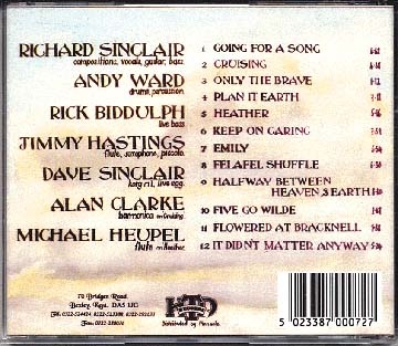 TRACKLIST 1 Going For A Song (4:41) 2 Cruising (4:38) 3 Only The Brave (1:12) 4 Plan It Earth (7:11) 5 Heather (5:16) 6 Keep On Caring (7:59) 7 Emily (5:54) 8 Felafel Shuffle *) (6:30) 9 Halfway Between Heaven & Earth *) (8:30) 10 Five Go Wilde *) (2:47) 11 Flowered At Bracknell *) (1:38) 12 It Didn't Matter Anyway *) (5:24) *) live | |
