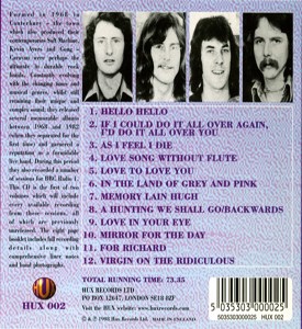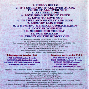 TRACKLIST 1 Hello Hello (2:52) 2 If I Could Do It All Over Again, I'd Do It All Over You (2:48) 3 As I Feel I Die (4:32) 4 Love Song Without Flute (3:21) 5 Love To Love You (2:26) 6 In The Land Of Grey And Pink (3:40) 7 Memory Lain Hugh (4:55) 8 A Hunting We Shall Go/Backwards (8:25) 9 Love In Your Eye (13:53) 10 Mirror For The Day (4:15) 11 For Richard (15:04) 12 Virgin On The Ridiculous (7:00) tracks 1, 2, 3 recorded for Top Of The Pops 19.8.1970. tracks 4, 5, 6 recorded in session for Alan Black 11.3.1971, first transmitted 9.4.1971. tracks 7, 8 recorded in session for John Peel 20.8.1973, first transmitted 30.8.1973. tracks 9, 10, 11, 12 recorded in session for John Peel 7.2.1974, first transmitted 14.2.1974. tracks 1, 2, 3, 4, 5, 6, 7, 8 are original mono recordings. tracks 1-6, 9-12 are also included on the 2CD "The Show Of Our Lives, Live At The BBC 1968-1975". tracks 1-8 are also included on the Bootleg 2CD "The Canterbury Tapes". |
