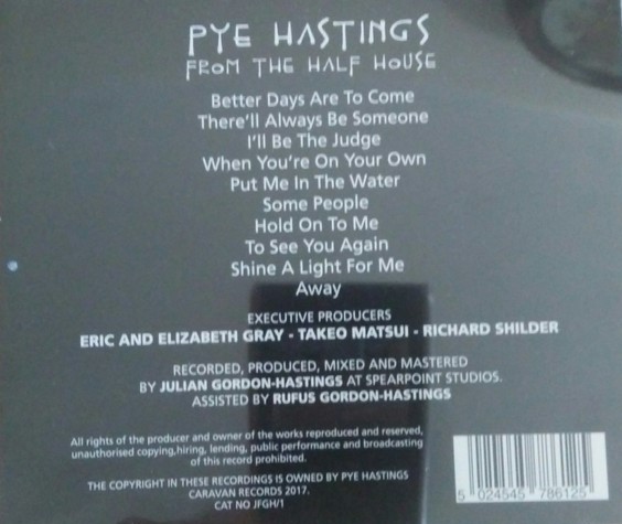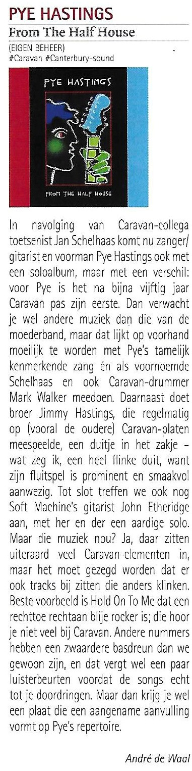 Goed voor een mooie plek tussen 'The Battle Of Hastings' en 'The Unauthorized Breakfast Item' van CARAVAN. Al decennia heeft Pye Hastings z'n zinnen gezet op het maken van een solo-album. Dit om eens aan de gang te gaan met z'n liefde voor soulmuziek, zo wil het verhaal. Maar minstens één poging werd verijdeld: 'The Battle Of Hastings' begon als solo-project om toch te eindigen als twaalfde album van CARAVAN. Het ontbreken van naamsbekendheid was een struikelblok. Maar de tijden zijn veranderd. Het is nu mogelijk om lekker in een thuisstudiootje nummers op te nemen en de resultaten digitaal aan te bieden. Waarbij voorinschrijvingvoor de nodige fondsen zorgt. En zo ging Pye Hastings ook deze weg op. Met als resultaat: 'From The Half House'. Centraal thema. Of het zo bedoeld is of niet, in de eerste zeven songs laat zich een centraal thema ontdekken: hoe houdt de eenling - geconfronteerd met een onverschillige massa en verslechterende leefwereld - hoop op verbetering, geloof in een betere wereld? Een album met een licht misantropisch inslag dus. We kunnen bijkans spreken van een concept album. Na het zevende nummer zakt het album qua spanning wat in. Even zo goed zijn songs acht, negen en tien prima te verteren. Pye is en blijft een begenadigd songschrijver. Zang. Sinds 'I Know,Why You're Laughing' van TBOH weten we dat Pye een fraaie croonersstem bezit. En die horen we nu, tot tevredenheid stemmend, in alle nummers. Arrangementen. Her en der dalende bas- en melodielijnen. Vijf of zes gitaarsolo's door John Etheridge, maar vooral veel karakteristiek windwerk van broer Jimmy Hastings, waardoor dit album heel erg CARAVANesk wordt. Na de eerste drie nummers volgen nog twee wat uptempo nummers en dan komen we meer in het stramien van 'Lingers Field' en 'Straigth To Your Heart' van TUBI, zij het ingenieuzer gemaakt, rijker gearrangeerd. Nummers. 1. Better Days Are To Come. De tekst behandelt de noodzaak om te blijven geloven in zonniger dagen, nu we dagelijks geconfronteerd worden met nieuws en gebeurtenissen, die zwaar op het gemoed kunnen drukken. Drums en bas nemen de zwaarmoedigheid voor hun rekening, fluit en saxspel houden dansend en swingend ons de hoop op zonniger dagen voor. Een tekst met licht politieke inslag, Forse drum en bas rolt ons tegemoet in het maten. In het refrein horen we een echo van de hook van 'Revenge' van TUBI. Fraaie gitaarsolo van Etheridge, die doet denken aan Doug Boyle. Zodat we hier heel TUBI-achtig doende zijn. Ook de pianoslagen van Jan en natuurlijk het fluitwerk van Jimmy, overlopend in mooi saxspel, contrasteren fraai met de doorlopende drums en bas. Als Pye de zang herneemt, en het orgel aanzwelt, weten we een ding alweer zeker: dit is een song op het niveau: CARAVAN klassieker! 2. There'll Always Be Someone. Voel je je buitengesloten, komt een eikel je dat met een vloed van woorden ook nog 'ns inwrijven! Wat zeg je dan? De muziek trekt de zwaarmoedige toon van Better Days are to Come lekker door, al is er nu sprake van een meer stotend ritme. De drums zorgen nu in hun eentje voor het doorgaande stampen en deinen. Fraaie dalende bas- en melodielijn. Het orgel loopt lekker mee met Pyes zang. Gitaar voegt zich daar later bij. En soleert later rond de zang. De solo loopt door, tegen de achtergrond van de dalende melodie.Om uit te lopen op een herhaling van het korte gitaar. 3. I'll Be The Judge. We dienen te verschijnen voor een rechtbank. En ontkennen gaat niet helpen! Gelukkig blijkt er geen verschil tussen rechter en gedaagde. Wat volgt, is een passende opening van de zitting met effectvol glissandospel op de elektrische gitaar. Deinende funky drums en bas. Even wat korte uithalen op het orgel (om de rechter aan te kondigen) en de rechter steekt van wal, heel kaal begeleid door niet meer dan slaggitaar, bas drums en nauwelijks hoorbare synth. Lopen de eerste coupletten heel rustig, toenemende heftige orgeluithalen voeren, gelijk met de tekst, de spanning ter zitting op. Het refrein dreunt en deint. Daarna wat rollende elektrische piano, (die eigenlijk te zacht staat om kennis van te nemen). Geleidelijk neemt het gitaargeweld tijdens de coupletten toe. En dat werkt bepaald spanning verhogend. Dan komt Jimmy erin met de dwarsfluit. De eerdergenoemde orgeluithalen versterken temeer het contrast tussen het swingende, dansende fluitwerk en de doordreunende achtergrond . Vervormde gitaar schroeft de deining op tot golfslag tien Beaufort. Een schitterende finale van een opening met drie doordreunende, opzwepende nummers. Achttien minuten voetjes van de vloer! Dit trio kan, wat mij betreft, subiet bijgeschreven worden als een nieuw hoogtepunt in het oeuvre van........... CARAVAN. Het swingt als in de dagen der grote suites. Want het zo karakteristieke, uit duizenden herkenbare windwerk van Jimmy drukt danig z'n stempel op de drie nummers (en naar verderop blijkt op het gehele album). Maar dan, na een ongebruikelijk lange pauze............ 4. When You're On Your Own. Keren we terug naar de situatie van de loner, de eenling tegenover de ons negerende massa in no. 3. 'There'll always be someone'. Maar ook hier is er hoop op 'something better than this' En...... zijn we terug bij de tingeltangelgitaren, zoals we die ook horen op Linders Field op TUBI. Niet lang, synths en fluit voegen zich bij de gitaren, met een reminiscentie aan een doedelzakband. Gelukkig zetten de drums stevig aan. Verderop toetsen uit een speeldoos. De song eindigt met een saxsolo, zoals we die ook van TUBI (It's gettin a whole lot better) kennen, tegen een achtergrond van fraai dalende bassynths, die even later plaats maken voor piano-accenten en orgel. 5. Put Me In The Water. Onze eenling (elckerlyc?) mijmert voort. Weemoed om de goede dagen van weleer, want niets is - meer dan ooit - blijvend. We kijken uit naar iemand met een visie en een missie. En we zijn er zeker van "Someday Someone Will Come". Wat we als een herdoop (' Put me in the water' immers) zullen ervaren. Stotend ritme, drijven