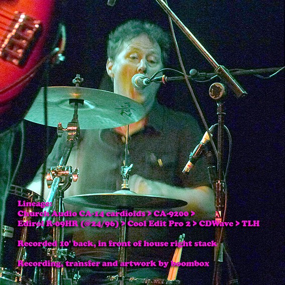 Sound in the venue was excellent and the audience respectful, so the recording came out very well; nothing to do apart from fades and volume adjustments. Crank this one up and play loud, then buy a ticket to see the band if you can, and/or buy the merch. Lineage: Church Audio CA-14 cardioids > CA-9200 > Edirol R-09HR (@24/96) > Cool Edit Pro 2 > CDWave > TLH Recorded 10' back in front of house right stack |