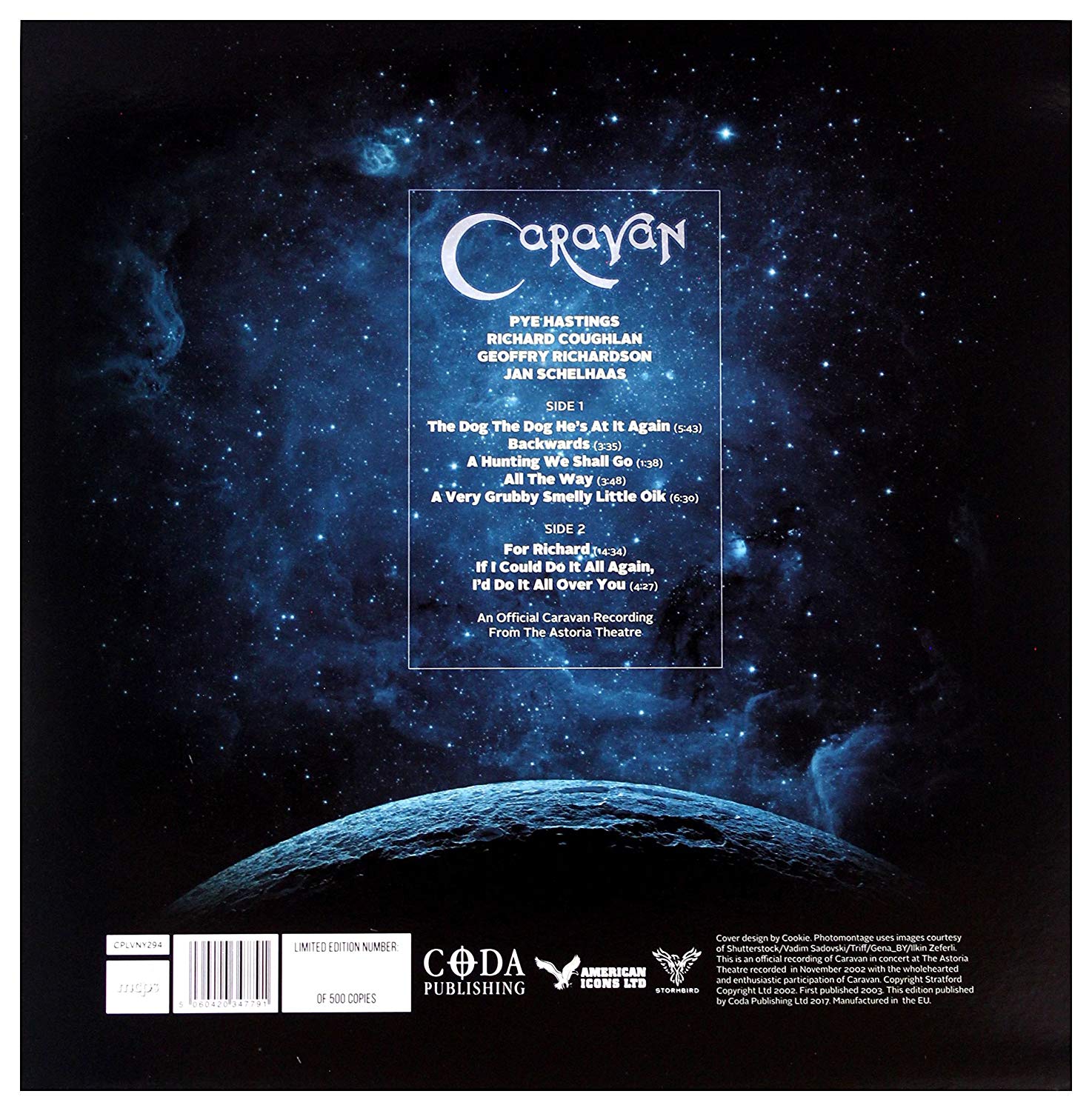 Can't report this under copyright infringement as it's a challenging situation that has not been legally approachable for the 16 years that the source material owner, Robert Kirk Carruthers, has been reissuing under various disguises or third party publishers. The recordings both in audio and visual mediums, were never authorised for release by members of Caravan or their management at the time of the recording and since. This latest reissue, this time on vinyl of the Nearfest/Patriots Theater 2002 gig cannot be claimed to be an official recording as Coda Publishing does so much to note. It is not sold in any marketplace but Amazon and third parties and never discussed or promoted by the band or their management in any form. Another rehash of many that have come before, after a considerable break in schedule, now this latest package has been cleverly titled and branded to play upon nostalgia and deceive Caravan's fan base with the limited edition run also added to further push the product. The previous issues of poor production, A Night's Tale, Rare Broadcasts, Grey, Pink and Gold, Live On Air (also DVD issues: The Anthology, The Ultimate Anthology, The Ultimate Collection) with equal little package production value, were not authorised and not a single penny has been received by any band member for any of them. As a descendant of a founding band member it is in such personal disgust of this man profiting from the same blackmarked material over and over, now 16 years on, I'm speaking out on behalf of the Caravan legacy. With no response from Amazon or movement to clamp down on such practices, for the benefit of the Caravan fan base and market, please investigate Coda Records and Coda Publishing along with Sandbeach Holdings, Classic Rock Productions, Ragnarock Films etc and ban this product from sale in the Discogs marketplace, with bootleg status. For the collectors, please do consider not helping this man to continue rehashing the same material by not purchasing or trading these products and support Caravan's current independent releases available at http://www.officialcaravan.co.uk and http://paradisefilter.com/ or the licensed back catalogue published by Universal. Thank you. Slappyhead (DISCOGS) An unauthorised bootleg reissued and repackaged yet again On behalf of the Caravan community I am acting on my own risk to let it be known that these releases are neither authorised or associated with the present and past members and management of Caravan. Past manager Mark Powell publicly issued an official boycott for the sale of material from this concert which was recorded 30th June 2002 at The Patriots Theater, Trenton, New Jersey USA, the band appearing exclusively for the 2002 NEARfest Festival. Mark's statement can be read via an archived copy of the band's past official website: http://web.archive.org/web/20050411200349/http://www.caravan-info.co.uk/article.php?id=32 This CD is a repackaged reissue of truncated bootleg material previously available as 'A Night's Tale: Live In The USA' (issued by Classic Rock Productions ltd in 2003), 'Grey, Pink and Gold' (issued by Retro in 2004), Live On Air (issued by Southworld in 2010). There was also an unauthorised DVD release of the concert titled 'A Knights Tale: Live in the USA' (issued by Classic Rock Productions ltd) which to has been repackaged and reissued under alternative titles and distribution companies (including Ragnarock ltd, Ragnarock Films, Music Reviews ltd, Sandbeach Holdings). This material has never been authorised for release by the band and their management past and present and not a single penny has ever been received by members of Caravan from any of the many releases. The Store For Music ltd is the latest record label to release this material and it is possible that once again it has been third party licensed to them "in good faith" by the person which I for unjust legal reasons have to refrain from publicly slandering. I have attempted to warn Store for Music about this material but they have refused to listen and thus have gone ahead with this reissue. For authorised and approved releases check out Demon Records' new issue of the 1990 ITV Bedrock television concert titled Access All Areas now available as a remastered CD/DVD package with exclusive bonus material. Salvo have issued a PAL release of the band's 2010 television recording at Metropolis Studios in London which is combined with an exclusive CD release. In addition, the band have released many more official live recordings from 2010 through to 2015 which are part available from the official Caravan website including a DVD of their most recent USA concert. Much love, NB Slappyhead 1/5 15.02.2015 (PROGARCHIVES) The band, the band, they're at it again. I have never been to a live Caravan show nor have I followed thier every move, but I really prefer the original line up. This show was recorded at the Astoria in London to a full house, in late 2002 I belive. I was expecting a mediocre show/video but it's actually pretty damn good! First my gripes: Richard C's drumkit is mixed just a bit too soft (other than that the mix is excellent), and please I wish they and more bands would bring a REAL HAMMOND organ istead of these plastic digital keyboards. A Hammond/Leslie setup would add a whole thrilling new dimension to the sound. Alas, they opt for the sterile digital keyboards. such a shame. The performance is given with appearant enthusiasm and enjoyment from the whole band. There are lots of extended numbers here with impressive instrumental workings like the twin guitar/violin leads on "A hunting we will go". Most the playing is tasteful and well balanced, sometimes they realy get cooking. The disc cashs in at a healthy 95 minutes. Pre-gig band interviews are placed between songs quite nicley. Stage is well lit, camera work is sensible and doesn't distract and the audio/video quality is the best I've seen yet from the Classic Rock Legends label. Thumbs up to both