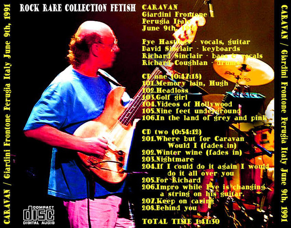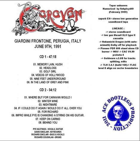 ROCK IN UMBRIA '91 (2011) TRACKLIST CD1 (47:18) 1 Memory Lain, Hugh 2 Headloss 3 Golf Girl 4 Videos Of Hollywood 5 Nine Feet Underground 6 In The Land Of Grey And Pink CD2 (54:12) 1 Where But For Caravan Would I 2 Winter Wine 3 Nightmare 4 If I Could Do It Again I Would Do It All Over You 5 For Richard 6 Impro While Pye Is Changing A String On His Guitar. 7 Keep On Caring 8 Behind You Recorded Live 09/06/1991 at Giardini Frontone, Perugia, Italy | |