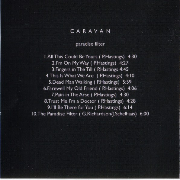 First and above all: I'm very biased concerning every note Caravan plays and played. My absolute admiration of the whole oeuvre is rooted in the unbelievable talent of Pye (as well as Dave) to compose 'hooks'. No song is excluded there is always an intriguing hook. And with its ten songs, Paradise Filter (PF) stays in this line as all the albums do. Of course there are differences in appreciation of the more - so to say - 'superficial' characteristics of a song: the arrangement, tempi, used instruments, text, etc. The overall order of the songs is nice and elegant: at first I judged "Fingers in the Till" as good, but according to our CARAVAN-standard with minor chances to grow to a favourite. But now after the opening of PF with two up tempo songs the subdued intro of "Fingers in the Till" is a wonderful contrast. A real counterpoint, a very strategic - i.e. psychological moment, adding to the appreciation of songs and album. The opener "All this could be yours" is a very strong song. With a nice solo on the viola. So PF opens as strong as TUBI does with "Smoking Gun". "All this" will be is also a very strong opener of the gigs (as "Memory Lain Hugh'' for a long period uses to be). The character of "All this could be yours" is extended on a fine manner in "I'm on my way". With now the organ somewhat more in the foreground and a guitar solo of Geoff. Which I hope he will play live more fierce, spunky. This album version is too modest, too ripling. The organ solo has already this fierceness. So live this will be (and already is) a highlight in the show! As I experienced November 2013. As said: "Fingers in the till" is opening very charming and the whole song has grown, in my opinion, compared to the first version on the Shepherd Bush album. It has lost the somewhat misantropic sphere on the latter. Due to a much more light, sparkling arrangement (the pianoparts!) which causes the right contrast between music and text. Song four "This is what we are" takes up the uptempo of the first two songs. Also a very fine song. Now Geoff is soloing with a spunky mood. And the rolling, growling bass is also a tasty surprise. "Dead man walking" gives us a range of surprises: first the text, this the third time Pye has written a socially engaged text (see "Send Reinforcements" on the Cool Water album and of course "All this could be yours"). I'm wondering if this text is inspired by Cathy's experiences as a lawyer? The song itself is beautiful, it will grow to one of the albums highlights. Its building up an immense tension, right from the beginning (due to the percussion - my compliments for Mark!). Followed by the long extended outtro with the desperate touches on the piano, imagining the slow walk to the electric chair. In one word: great. In my opinion these five songs form, musically spoken, a real suite - should they melted with some nice or weird interludes together. So, in a subtle way, the diehard fans are getting where they are longing for so passionately............. With "Farewell my old friend" - a second moment of contrasting rest is presented. The beginning of the song tends to refer a little bit (with emphasis - a little bit) on cliches, lend from tearjerking songwriting. But there is also a very nice viola contribution, referring to the play on "Better by Far". Then we are arriving at "Pain in the arse". A novelty, funk on a CARAVAN-album . With fine, soulful soli both on the guitar as on the organ - fine outbreaks - hope Jan gets a chance to play these outbreaks live!! I propose the audience then will freak out. "Trust me, I'm a Doctor" is firmly rooted in the tradition of "The Dog, the dog", ridiculizing some person or social category. These tongue-in-cheek texts are hard to appreciate fully for me. But the rocking uptempo is very fine - is it a waltz? Due to the mandolin, "I'll be there for you" refers strongly to the album "The Battle of Hastings". With its strong marching pace also a fine song, with of course - very nice mandolin playing. Pye's voice is in good condition. I always find he has a voice very apt in the lower regions for 'crooning'. So here is the solution to the problem he suffers a loss of reach in the higher regions. The solos are on the short side - to my regret. With the exception of the solos on "Dead Man". The result of the decision to create a modern popsong album? Coming to an overall view: A good Caravan traditional, (since 1982) with guitars, basses and synths in a good balance. (Geoffs guitarsoli could have been recorded a little bit louder). A strong, moody album, which will be even more appreciated live, when the band sees a chance to develop the songs to eight minute pieces with ample room for typical Caravaneske breathkilling solo's! Jasper A. Smit 30.01.2014 (COCACAMP.NL) Ik begrijp ook wel dat de muziekwereld niet op haar grondvesten staat te trillen, omdat Caravan voor het eerst in tien jaar weer eens een nieuw album uitbrengt. Voor liefhebbers van de Canterbury- scene is het toch zeker een gebeurtenis om blij van te worden. Niet alleen omdat Caravan laat horen dat de band nog steeds ‘alive and kicking’ is, maar vooral omdat Paradise Filter een zeer aardige plaat is. Sterker nog: het is een typisch Caravan- album, want het is een groeibriljantje dat steeds beter wordt naarmate je het vaker draait. Opener All This Could Be Yours begint met dat kenmerkende slaggitaartje van bandleider Pye Hastings, voordat de ritmesectie bestaande uit drummer Mark Walker en bassist Jim Leverton opgewekt invalt en er blije muziek wordt gemaakt. De meeste tracks klokken tussen de vier en vijf minuten, dus er staan helaas geen epics van het kaliber For Richard en Nine Feet Underground op de nieuwe cd, maar er staan wel degelijk enkele afwijkende songs op. Neem bijvoorbeeld This Is What We Are met een voor Caravan-begrippen zwaar gitaargeluid, of Dead Man Walking dat nu eens geen opgewekte kost bevat. Afsluiter The Paradise Filter is de enige track die niet door Hasting