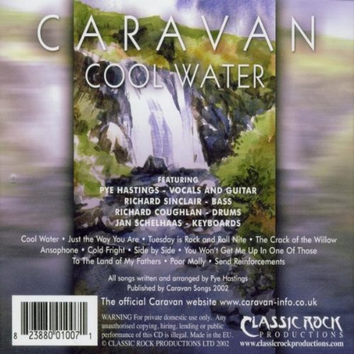 Though I was a Caravan/Canterbury fan beginning around For Girls Who Grow Plump (1973), easily the most absurdly tuneful LP of that year, this side of Hatfield and the North's debut, Cool Water is where bandleader Pye Hastings and I begin to part company. Though he is certainly an estimable talent, his several compositional misfires on, say, the original Caravan foursome's 1990 release Back to Front (and considering how he apparently insisted they be included anyhow, thus weakening the record overall) may have been the harbinger predicting this set. Originally recorded in 1978, with a 'pickup' lineup of sorts (Richard Sinclair, bass; Jan Schelhaas, keys; the late Richard Coughlan, percussion), Cool Water consists of all Hastings' tunes from that session but none of Sinclair's (this group did record Sinclair's delightfully silly 'Down on the Farm,' but that had to wait until a Camel record some years later to see the light of day). Considering also Schelhaas' fine 'Man in a Car' from the previous Caravan release Better by Far, one wonders if he too wrote anything for Cool Water that ended up on the cutting room floor. Though Pye's objectionable A&R decisions for Cool Water (which finally came out in 1994) don't do the record any favors, at least the tunes he did include were generally high-quality romps of the sort Hastings penned for Better By Far. If you liked that one, you'll appreciate this. 'Ansaphone' employs a twisty Schelhaas synth break, a trademark Caravan hooky chorus and another of Pye's wistful jilted- boyfriend tales, for example. Probably the best tune here. 'Crack of the Willow' won't make you forget Roy Harper's 1975 HQ album but it is an amusing pastel of a day out playing cricket. The title bit is too slow to open the record (most Caravan releases start with an uptempo bang, like 'Memory Lain, Hugh/ Headloss' or 'Here Am I' (Blind Dog at St. Dunstan's, to my mind the last great Caravan album), and Pye's tale of a night out imbibing doesn't really explain why he thinks 'cool water' will help his predicament. To bathe in? To drink? But Schelhaas is there with a cheerful electric piano break, and Sinclair's bass hits all the right corners, showing there was a potential 'band' here if only Pye had pursued the matter further. A word here about Mr. Coughlan, the redoubtable drummer who left us in 2013 after a lengthy illness: on Cool Water as on every Caravan release he participated in, the man proves himself to be one of the best rock drummers of his time. Always tasteful, never showy, he enlivens this record (especially 'You Won't Get Me Up in One of Those') with lively fills and the odd cheery splatter. Well done, sir, and you're sorely missed. No, there really are no clunkers here (though the closing 'Send Reinforcements', good track that it is, continues the rather sad cast of Better by Far's coda 'Nightmare'); it's more a case of what might have been, had Hastings insisted that Sinclair's tunes be included. Kenneth Egbert 11.08.2015 (ALLMUSIC) I do realize that a «from-the-vaults» release of an entire album that was originally deemed unfit for release by Caravan's record label at a time of general decline for Caravan is hardly going to be exciting news for the non-diehard fan. But yes indeed, after the critical and commercial failure of Better By Far, Caravan did record a second album for Arista, scheduled for release in 1978; and Arista did reject it, shelving the tapes for more than 15 years, before Pye got hold of them, dusted them off and released them pretty much as they were, on a minor label. And the most surprising thing about it is — Cool Water is, by all means, «better by far» than Better By Far, or, for that matter, anything else that Caravan did in the late 1970s and early 1980s. Actually, if I am correct, only the first seven tracks here really come from the promised album; the surprisingly short length (32 minutes) is explained by the fact that the release only gives us the compositions by Hastings, leaving out a few contributions by Richard Sinclair — who did, as it turns out, temporarily return to the band in 1977 before leaving again to join Camel; apparently, one of the songs that he'd originally recorded with Caravan in that period eventually became Camel's 'Down On The Farm' (which is hardly surprising, since it always had that lightweight, downhome, facetious Caravan groove to it). The CD release is further padded with four tracks from a later session — not sure about the year, but the only Caravan member on that session was Pye, accompanied by Roxy Music's John Gustafson on bass and future Marillion member Ian Mosley on drums. The songs do sound stylistically similar to the main material, though, so there will be no jarring break in perception. Anyway, the key difference from typical Caravan output of the period is that, although this is still strictly a pop album, the songs are somewhat tighter written and contain more seductive melodic moves than usual. Formally, the title track might be one of those smooth-jazz-meets-adult-contemporary borefests, but Schelhaas chooses some epic keyboard tones (and it is cool how the song has Minimoog, electric piano, and organ all going on at the same time), and the chorus transforms the song into a heartfelt prayer — and we do not know many Caravan songs that sound like prayers, do we? Unfortunately, nobody seemed to take that request literally and give Mr. Hastings some cool water as requested. But even if you still get bored with the song's slow tempo and way-too-soothing arrangement, 'Just The Way You Are' is the first in a series of upbeat pop tracks with cute 'n' catchy singalong choruses that show Hastings had definitely not run out of ideas by that time — there's also 'Cold Fright', a piece of funny funk-pop, and, among the later bonuses, 'Poor Molly', one of Caravan's (or, in this case, solo Hastings') rare forays into disco, and the calypso-influenced 'You Won't Get Me Up In One Of Those'