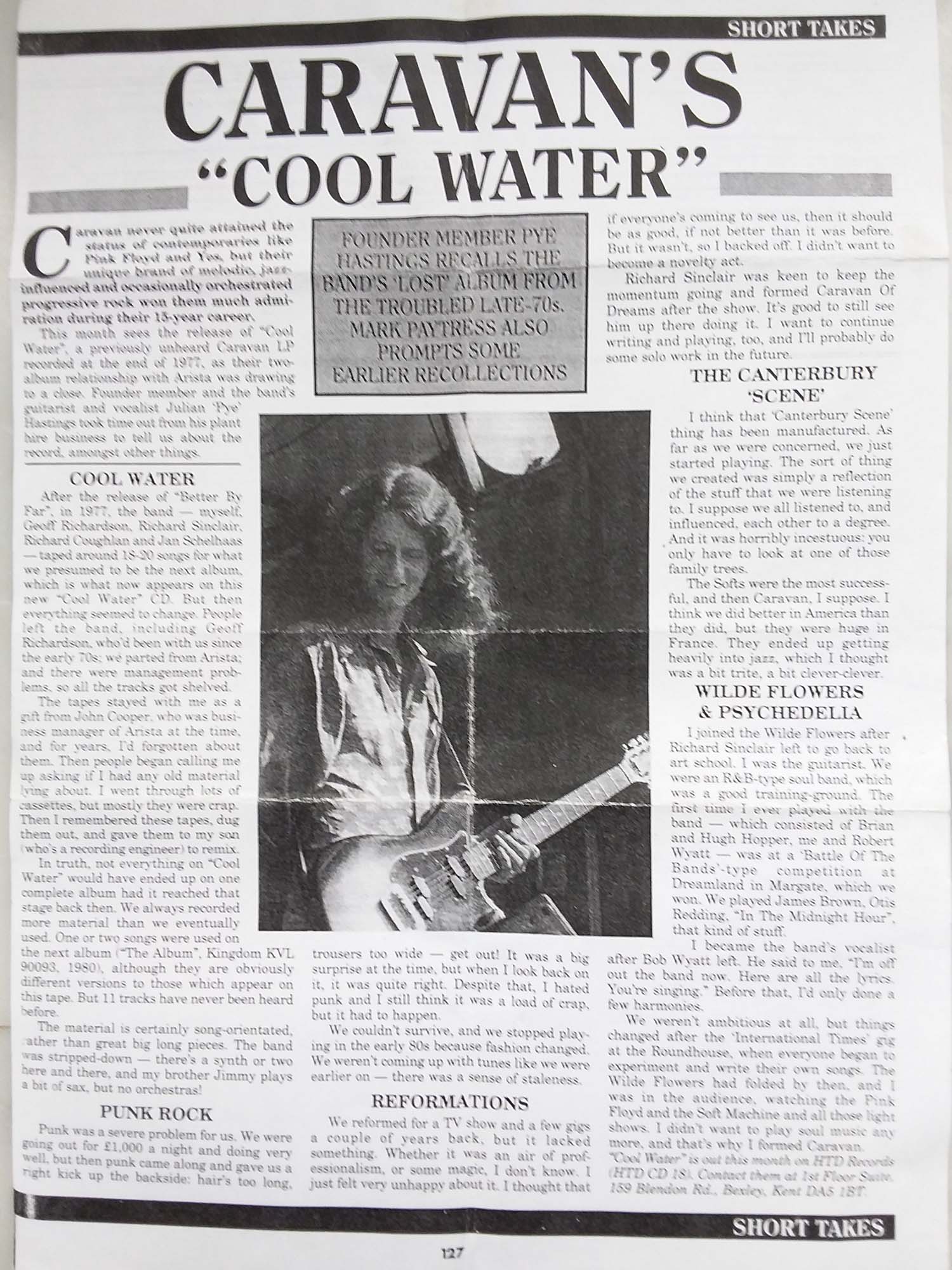 Geoffrey Richardson didn't participate in the studio recordings of Cool Water and left the band in April. The last four songs were recorded with the assistance of three members of the Gordon Giltrap Band (1978-79): Ian Mosley (drums), Rod Edwards (keyboards) and John Gustafson (bass). So, in fact: Pye Hastings solo! In the vaults there are still songs penned by Jan Schelhaas or Richard Sinclair. Sinclair later published 'Emily' on 'Caravan of Dreams' (1992) and 'Uncle's Farm' on his 'Live Tracks' album (1993).(it is an early version of Camel's 'Down On The Farm'). Two Hastings' songs - 'Bright Shiny Day' and 'Heartbreaker' - were used on 'The Album' (1980). The left-overs: What Elephant? // Mark 53 // Funky Love // Fireman //Space Cowboy //Pelican // Bicycle Belle // Acc.Mo. are still unpublished. |