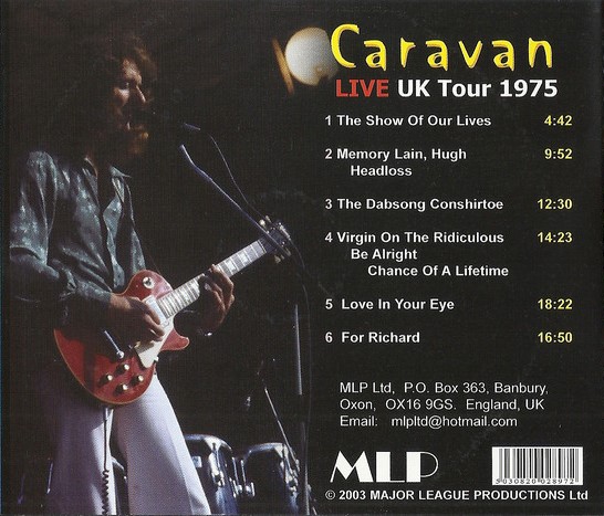This live recording was made a few months after the band had released "Cunning Stunts" in 1975. By that time keyboard player David Sinclair had left the band and was replaced by Jan Schelhaas. It is the same line-up that would record "Blind Dog at St. Dustans" a year later. Although this is not the most famous period of the band, live they were very good. And so is this live recording. It contains the obvious classics (For Richard, Love in Your Eye) and of course tracks from "Cunning Stunts" (The Show Of Our Live, The Dabsong Conshirtoe). The tracks are very long, so there is plenty of room for instrumental interplay. The sound quality of the recording is excellent, so I recommend this to every Caravan fan. Agemo 4/5 14.04.2006 (PROGARCHIVES) Always have and probably always will love live albums, specially archive releases,such like this one. 'Live UK' was recorded for a radio program that took place on December 5, 1975 at the Nottingham Polytechnic, following the release of their 'Cunning Stunts' long-player. Six tracks, with a duration of more than 75 minutes of really great '70's progressive. Noticed here that keyboardist Jan Schelhaas has replaced group co-founder David Sinclair. Considering that factor, this disc isn't a bad choice at all. Sound is good. Cuts I liked best were "Show Of Our Lives" and the two 17-minute plus epics "The Love In Your Eye" and "For Richard" (my personal Caravan favorite). Give it a spin. Mike Reed 4/5 28.10.2005 (AMAZON) Don't miss this gem! Caravan -- what a band!!! This album is a relative rarity for some unknown reason that probably has more to do with the vagaries of the music business than with the album itself, but don't let that prevent you from enjoying it. Although this configuration of Caravan may not be considered their best by some, it's still an outstanding band that is head and shoulders above the vast majority of its contemporaries. The music on this CD just gets better and better after each play, which is typical of Caravan's music... The album contains The Show Of Our Lives (4:41), a traditional intro song of Caravan, and 5 long songs (Memory Lain, Hugh/Headloss: 9:53, The Dabsong Conshirtoe: 12:30, Virgin On The Ridiculous/Be Alright/Chance Of A Lifetime: 14:23 (an extraordinary rendering of this Caravan classic song), Love In Your Eye: 18:22 (with special twists and turns of this other Caravan concert classic), For Richard: 16:51 (in a very good version)), which have always been Caravan's forte and give the band time to expose, expand, amend and twist the long legs of their music. What's not to love? 'Nuff said... Pull out the hammock, pour your favorite drink, relax, play this CD, and have a ball. Viva Twain 5/5 01.05.2012 (AMAZON) Caravan is definitely one of the great names from the Canterbury scene and as already mentioned they are still active and even celebrate their 35th anniversary in 2003. This year will also give us a new album, which is being preceded by CD (re-) releases of much of their known and unknown older material. One that fits in the latter category is a live recording for a radio broadcast as part of their 1975 UK tour. This album contains six predominantly long tracks that give a good impression of the essential Caravan. During the period of this recording Geoff Richardson was a member of the band and his viola largely dominates the performances of the classic Caravan songs on this album. Next to Geoff, who also plays flute and guitar, the line up of the band was as follows: Richard Coughlin: drums and percussion, Pye Hastings: guitar and vocals, Jan Schelhaas: keyboards and vocals and Mike Wedgwood: bass and vocals. The concert opens with the very suitable “The show of our lives” (4:42) and although I can not confirm that this is indeed THE (best) show Caravan ever gave, it certainly is a good one and the recording that is made of it is also of good quality. The opening track is a more pop and vocal oriented song that has a beautiful melody. Track 2 “Memory Lain, Hugh Headloss” (9:52) is a Caravan classic, as is track 3 “The Dabsong Conshirtoe”(12:30). Both pieces are very representative for the repertoire of this band: long epic works, with pleasant vocals, a variation of (instrumental) themes and much room for solos on guitar and keyboard and, on this performance, also on viola. Sometimes, especially on their more early works, these solos tend to become a bit freaky. “The Dabsong Conshirtoe” features up tempo parts with more heavy, rock and roll like guitar riffs as a basis for viola and keyboard solos. The third part of this piece contains a short flue part that is reminiscent of Focus. The finale of this “concerto” is also typical Caravan: a repeating (guitar) theme guides the rest of the band to a more or less bombastic eruption of sounds. In spite of these sometimes heavy parts by and large the music radiates a rather relaxing atmosphere, mainly because of the easy vocal parts with nice harmonies, as in track 4. This is a compilation of three songs, “Virgin on the ridiculous”, “Be alright” and “Chance of a lifetime” (14:23). Beautiful melodies and typical instrumental parts with long organ solos based on classical patterns (could this be Procol Harum?).The second part of this medley gives us an intro with percussion that shifts to a “driving” rhythm. It finishes easy with nice guitar and viola solos that build up as a sort of bolero. The electric piano, which we hear more on the other songs during this concert, really contribute to the relaxing atmosphere. “The love in your eye” lasts more than 18 minutes (18:22) and has the same pattern as the previous songs. A few solo parts on this song are in the vein of Camel, especially where the keyboard solos are accompanied by rhythm guitar. Especially in this song the solos tend to become freaky and might get you lose your attention; at least it does to me. But let’s not forget that this is a recording from 1975, a period 