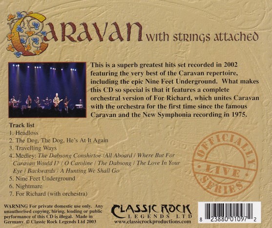 For authorised and approved releases check out Demon Records' new issue of the 1990 ITV Bedrock television concert titled Access All Areas now available as a remastered CD/DVD package with exclusive bonus material. Salvo have issued a PAL release of the band's 2010 television recording at Metropolis Studios in London which is combined with an exclusive CD release. In addition, the band have released many more official live recordings from 2010 through to 2015 which are part available from the official Caravan website including a DVD of their most recent USA concert.