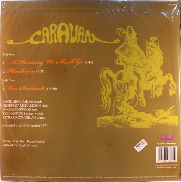 Rather lightweight live album, only thirty four minutes long, three songs and some painful applause herding for an encore. The line-up is essentially the Girls line-up, though John G. Perry's been replaced by an also-excellent Mike Wedgwood. The production is clear but the mix misjudged: the admittedly nicely brought out bass sound dwarfs all other elements. In particular, Pye Hastings' guitar is very low, the drums never seem to match the bass volume. Regarding the content, we have the minor classic suite A Hunting We Shall Go and Hoedown off For Girls plus the fairly seminal For Richard. A Hunting We Shall Go, despite some brief bits of curious improvisation, feels a bit pale and pasty without the superb For Girls production and frills. The riff is still magnificent. For Richard is translated brilliantly to the new line-up. Richardson's viola really changes the flavour of the piece to something a little more pastoral while the bass-heavy mix keeps it powerful and punchy as ever. Pye Hastings' vocals are fleeting but delightful. In the nearly 20 minutes running time, we see the whole plethora of cool, loose improvisations and tight, light-hearted rock music that defines Caravan taken over wholesale by a fresh line-up with a star soloist. Hoedown is the encore... lively tune but not really a show-stopper. Caravan bring out the participational elements of that song in a trite, amusing, ironic way with a calculated lack of charisma. Changed more drastically than hunting from the studio version, with Hastings' echoey guitar and Richard Coughlan's drums holding things down and various cutesy improvisations from the band's major instrumentalists. Hard to see what appeal this album will have for those who aren't devotees of Caravan and even those who are don't really need this. Still, the For Richard take on here is grade A live album stuff. Only two stars for the whole package, maybe a three for the performances; more than half of the stuff here could be part of an easily five star Caravan live album. Rating: Two Stars but quite good/15 Favourite Track: For Richard TGM: Orb 2/5 30.06.2010 (PROGARCHIVES) A live recording from 1974 released 34 years later. Caravan has a very good name which anyone can make some good money out of. Release a live recording and you make money. If the live recording also have a good sound, the better. This recording has also been lifted from a radio recording. Perfect. What we get here is three songs and the usual suspects which also features on numerous other Caravan live albums. The likes of Hoedown and For Richard. I also believe the opening song A Hunting We Shall Go is also present on other live albums. The songs are very well delivered although A Hunting We Shall Go is cut rather short. The songs are great and my review is not a reflection of that. If you can live with the rather cut short A Hunting We Shall Go and the pretty derogatory to Caravan herding back the leaving audience for the encore Hoedown, you will be fine with this album. You get the great For Richard here. By anger is the inclusion of this herding back the leaving audience incident on this album. Caravan does not deserve to have their name tarnished by having this on an album. Caravan was and still is a great band. Please don't insult them and don't insult those of us who really enjoy this band. My other complaint is that there are many other better live albums than this one on the market and it is safe to bypass this one when looking for Caravan live albums. Hence my rather sparse stars. toroddfuglesteg 2/5 22.11.2011 (PROGARCHIVES) This *album* was recorded at Ebbets Field, Denver, Colorado, on November 13th 1974 during their first tour of Canada and the USA. There is absolutely nothing new here and this is with no doubt something for fans and collectors only. Three tracks for a duration of about 34 minutes, "For Richard" being the main course as the longest track; add the title track and a stand-alone version of Hoedown, where the band learns their audience how to clap the 7/4 clave; fun but nothing more. All in all just enough to satisfy the completists; it is actually even unbelievable that a label decided to release this oddity anew on LP ..... in 2011, 37 years ahead of its performance! It may say a lot about the popularity and impact of an unequalled band! Music By Mail 2/5 17.08.2012 (PROGARCHIVES) |