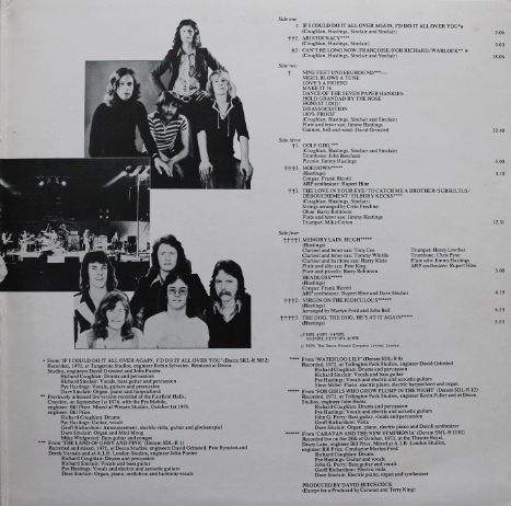 I've often wondered whether it would have been better if Caravan emulated Genesis with a Best of Caravan - The Longs and a Best of Caravan - The Shorts. This album contains three of their best long pieces, "Can't be long now/ Francoise/ For Richard/ Warlock", "Nigel blows a tune/ Love's a friend/ Make It 76/ Dance of the seven paper hankies/ Hold grandad by the nose/ Honest I did!/ Disassociation/ 100% Proof" and "The love in your eye/ To catch me a brother/ Subsultus/ Debouchement/ Tilbury Kecks". They came from If I Could Do It All Over Again, I'd Do It All Over You (1970), In The Land of Grey and Pink (1971) and Waterloo Lily (1972) respectively.