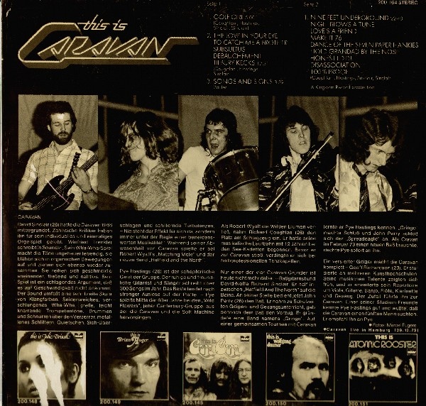TRACKLIST A1 Golf Girl (5:00) A2 The Love In Your Eye/To Catch Me A Brother/Subsultus/Debauchement/Tilbury Kecks (12:31) A3 Songs And Signs (3:39) B1 Nine Feet Underground/Nigel Blows A Tune/Love's A Friend/Make It 76/Dance Of The Seven Paper Hankies/Hold Grandad By The Nose/Honest I Did!/Disassociation/100% Proof (22:40) track A1, B1 are from "In The Land Of Grey And Pink" track A2, A3 are from "Waterloo Lily" Photos on cover show Caravan live in Hamburg 29.12.1973. |