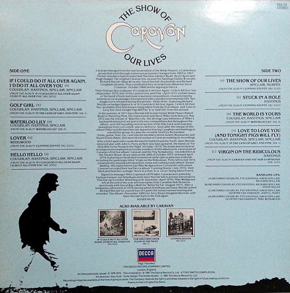 TRACKLIST A1 If I Could Do It All Over Again, I' Do It All Over You (3:07) A2 Golf Girl (5:00) A3 Waterloo Lily (6:47) A4 Lover (5:09) A5 Hello Hello (3:46) B1 The Show Of Our Lives (5:42) B2 Stuck In A Hole (3:09) B3 The World Is Yours (3:41) B4 Love To Love You (And Tonight Pigs Will Fly) (3:03) B5 Virgin On The Ridiculous (6:53) A1, A5 are from "If I Could Do It All Over Again, I'd Do It All Over You" A2, B4 are from "In The Land Of Grey And Pink" A3, B3 are from "Waterloo Lily" A4, B1, B2 are from "Cunning Stunts" B5 is from "Caravan And The New Symphonia" |