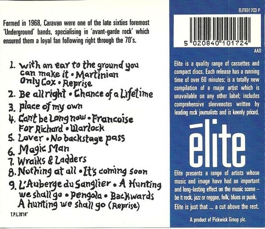WITH AN EAR TO THE GROUND (1991) TRACKLIST 1 With An Ear To The Ground You Can Make It/Martinian/Only Cox/Reprise (9:51) 2 Be Allright/Chance Of A Lifetime (6:29) 3 Place Of My Own (4:01) 4 Can't Be Long Now/Françoise/For Richard/Warlock (14:17) 5 Lover/No Backstage Pass (9:39) 6 Magic Man (4:00) 7 Wraiks And Ladders (0:59) 8 Nothing At All/It's Coming Soon (10:19) 9 L'Auberge Du Sanglier/A Hunting We Shall Go/Pengola/Backwards/A Hunting We Shall Go (Reprise) (10:02) tracks 1, 4 are from "If I Could Do It All Over Again, I'd Do It All Over You" tracks 2, 9 are from "For Girls Who Grow Plump In The Night" tracks 3, 6 are from "Caravan" tracks 5, 7 are from "Cunning Stunts" track 8 is from "Waterloo Lily" |