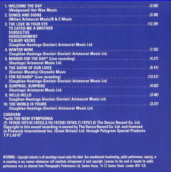 SONGS AND SIGNS (1991) TRACKLIST 1 Welcome The Day (3:58) 2 Songs And Signs (3:38) 3 The Love In Your Eye (12:29) 4 Winter Wine (7:35) 5 Mirror For The Day (4:27) 6 The Show Of Our Lives (5:41) 7 For Richard (13:57) 8 Surprise, Surprise (4:02) 9 Hello Hello (3:46) 10 The World Is Yours (3:37) tracks 1, 6 are from "Cunning Stunts" tracks 2, 3, 10 are from "Waterloo Lily" track 4 is from "In The land Of Grey And Pink" tracks 5, 7 are from "Caravan And The New Symphonia" track 8 is from "For Girls Who Grow Plump In The Night" track 9 is from "If I Could Do It All Over Again, I'd Do It All Over You" |