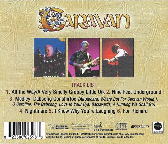For authorised and approved releases check out Demon Records' new issue of the 1990 ITV Bedrock television concert titled Access All Areas now available as a remastered CD/DVD package with exclusive bonus material. Salvo have issued a PAL release of the band's 2010 television recording at Metropolis Studios in London which is combined with an exclusive CD release. In addition, the band have released many more official live recordings from 2010 through to 2015 which are part available from the official Caravan website including a DVD of their most recent USA concert.