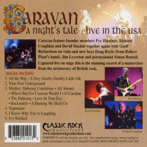 On behalf of the Caravan community I am acting on my own risk to let it be known that these releases are neither authorised or associated with the present and past members and management of Caravan. Past manager Mark Powell publicly issued an official boycott for the sale of material from this concert which was recorded 30th June 2002 at The Patriots Theater, Trenton, New Jersey USA, the band appearing exclusively for the 2002 NEARfest Festival. Mark's statement can be read via an archived copy of the band's past official website: http://web.archive.org/web/20050411200349/http://www.caravan-info.co.uk/article.php?id=32